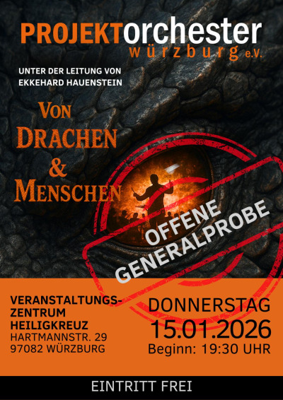 Liebe Freunde des Projektorchesters, aufgrund der hohen Nachfrage für unser Jahreskonzert veranstalten wir dieses Jahr zum ersten Mal eine offene Generalprobe. Kommt gerne am 15.01. im Veranstaltungszentrum Heiligkreuz vorbei und genießt unser Konzertprogramm in voller Länge. Beginn 19:30 Uhr Einlass 18:30 Uhr Eintritt frei!
